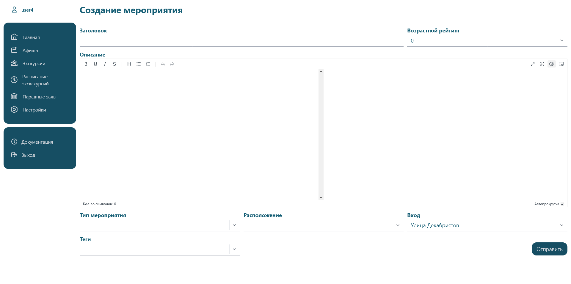 После нажатия на кнопку "Отправить" происходит проверка введенных данных. Если форма содержит недопустимые данные, под полем с ошибкой отображается красный текст, описывающий ошибку. Об успешном создании мероприятия сигнализирует всплывающее уведомление, затем открывается страница редактирования мероприятия.